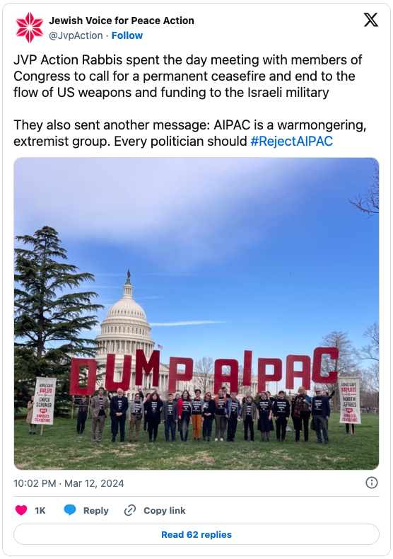 "AIPAC is warmongering and pro-apartheid," Rabbi May Ye with JVP Action, who is also a member of the Jewish Voice for Peace Rabbinical Council, said in a statement. "They do not represent Jewish people or the Jewish tradition."